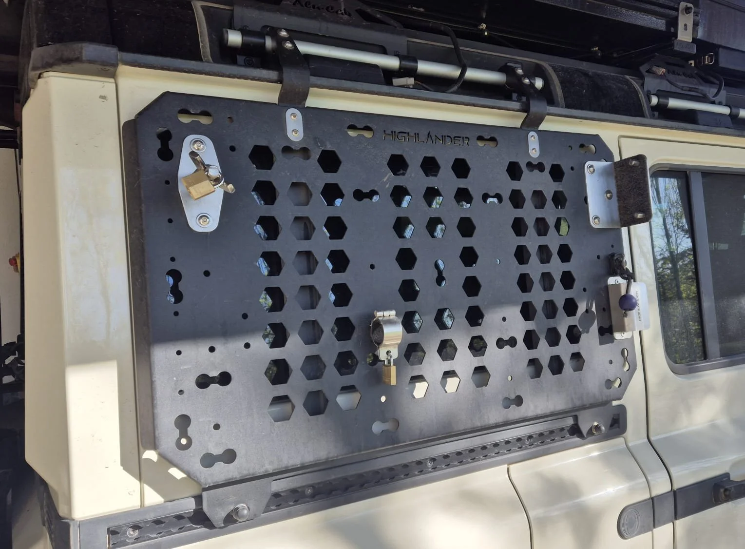 These panels are attractive and strong enough to comfortably carry your high-lift jack, spare water or fuel tanks, spade and MAXTRAX. The mounting system does not interfere with the power outlets on the roof.